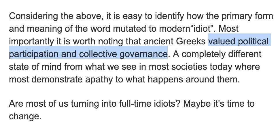 Example: Plato uses word IDIOT (ΙΔΙΩΤΗΣ), in the most literal sense, favouring the INDIVIDUAL/PRIVATE life in a [collective] democracy. It’s used as an insult!