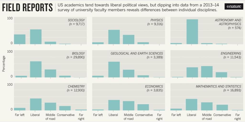 Contrary to popular belief, fields like Astronomy & Astrophysics have even LESS CONSERVATIVES than marxist/liberal fields like Sociology. Similar trend, of course, in all domains.