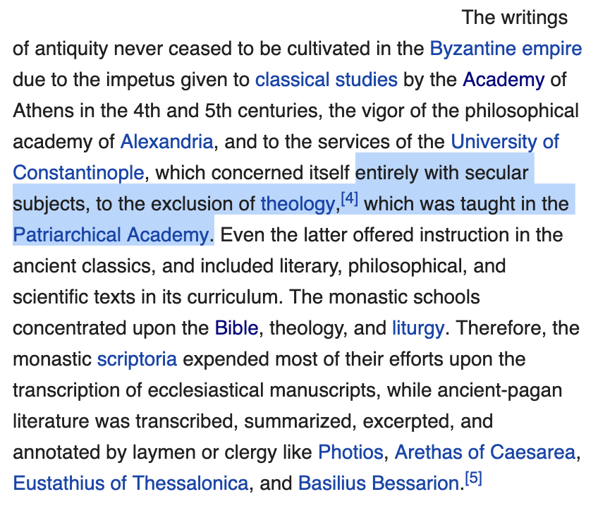 Contrary to University indoctrination, it was the Christian Byzantine Empire who introduced a SEPARATION between THEOLOGY + SCIENCES. And it was exactly because the Academy of Athens mixed those two domains.