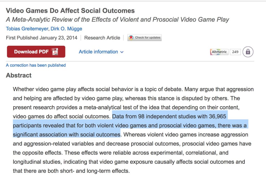 VIDEO GAMES AFFECT SOCIAL OUTCOMES. The keyword here is not “violence”. There are documented negative effects on aggression & prosocial behaviour, particularly in men. Why? It’s complex! We don’t know in what level this is affecting the society in the longterm.