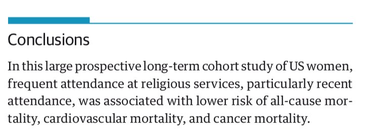 The most recent study I found in Internal Medicine. If you take just church attendance it may happen that unhealthy people go more often at church. How they controlled for this? They took 74 534 women WITHOUT serious disease and followed them for 20 years.