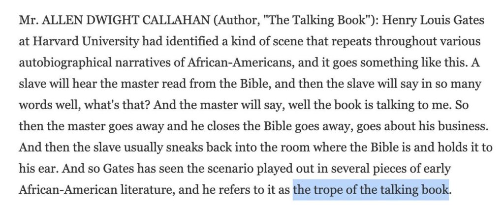 The same theme is repeated in history again and again. From the christian objection to classic Roman authority to Protestant objection to Roman Catholic authority. Same root: return to the ancient texts. For the illiterate black slaves, it was the “trope of the talking book”