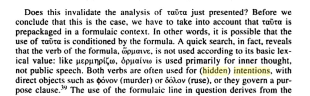 Greek language (New Testament & Classics) uses verbs particularly to distinguish public intentions from internal (true) ones. μερμηρίζω δόλον: thinking [internally] to harm μηχᾰνάομαι (same root w/ word “machine”): elaborate complex plans, typically to hide intentions