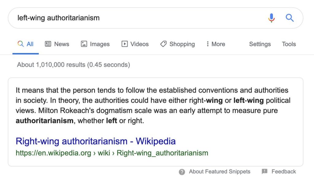 3/ Let’s google “left-wing authoritarianism”. The results? “Right-wing authoritarianism”. Left-wing authoritarianism doesn’t exist. It’s not an academic psychological construct. This speaks volumes: Zero respect for Truth. Zero self-reflection. Vicious reality shift. Shameless.