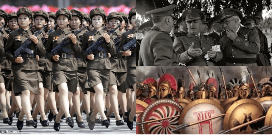 6/ The end game of authoritarianism (left-wing & right-wing) is the same: in-group conformism, strip away individuality. Compare: – North Korea – Franco’s Spain with – Athenian army (visual representation): soldiers hold individual (personally styled) colours, signs & arms.